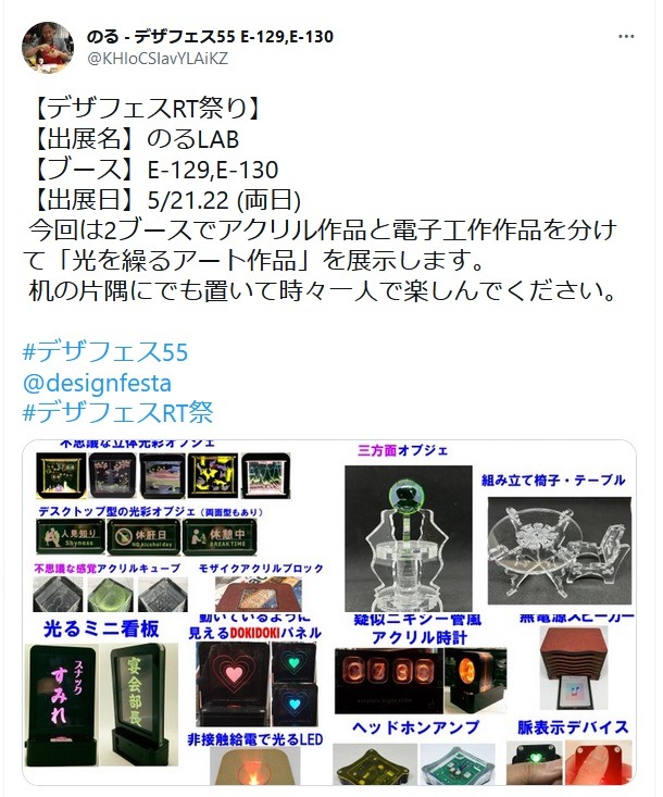 今回は2ブースでアクリル作品と電子工作作品を分けて展示します。