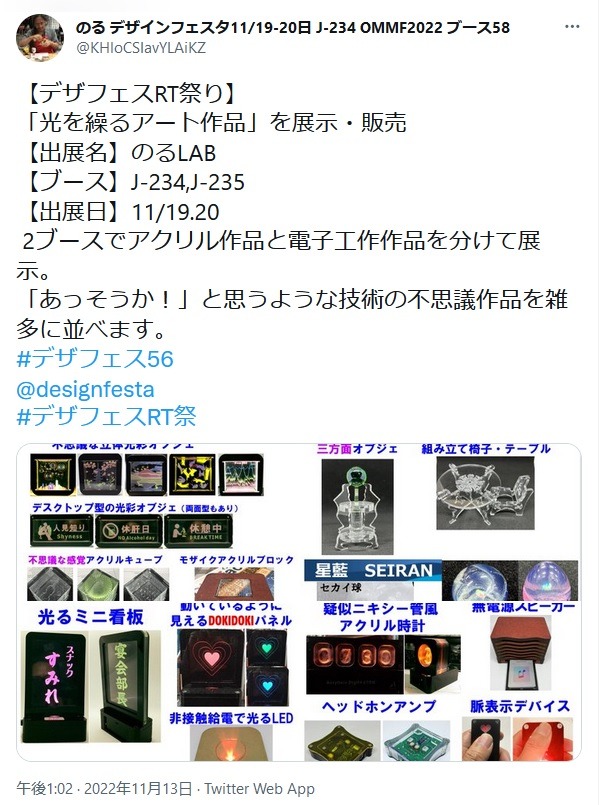 2ブースでアクリル作品と電子工作作品を分けて展示。