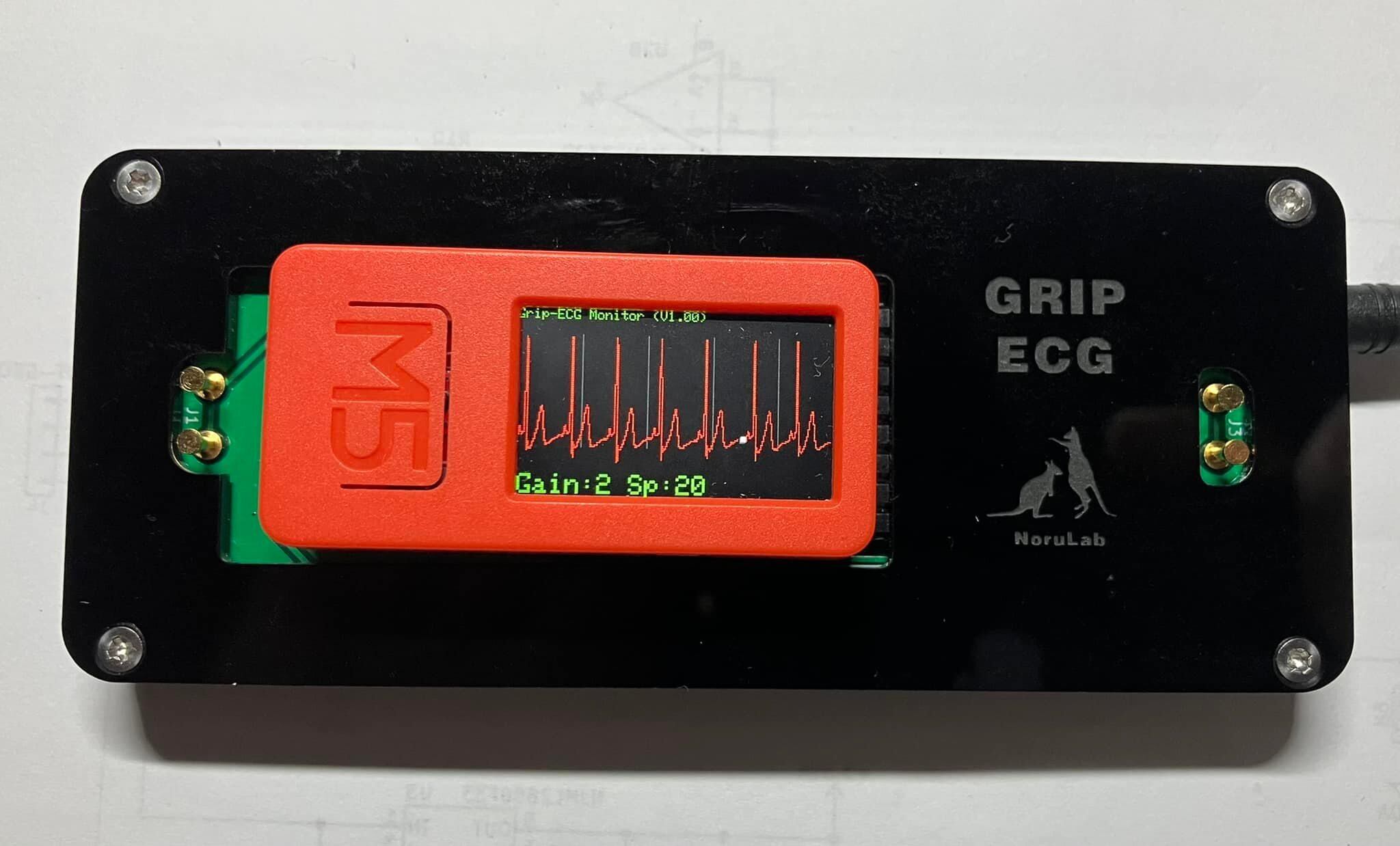 グリップ心電図センサユニット(GRIP-ECGSENS03)は、左右の電極ピンを左右の手で握ることで四肢第Ⅰ誘導の心電図(ECG)波形をアナログ出力するアンプユニットです。指で押さえるよりも握る方が電極への接触が安定することから作成しました。高価なディスポ電極が必要ありません。M5StickCPlusをそのまま装着できる他、GROVE互換端子を用意しているので外部のM5StickCPlusやWioTerminalなどのデバイスで波形を取得することができます。電源は装着M5StickCPlusあるいはGROVE互換端子から供給します。安定に計測するために接続しているデバイスは内蔵バッテリや電池を使用してください。